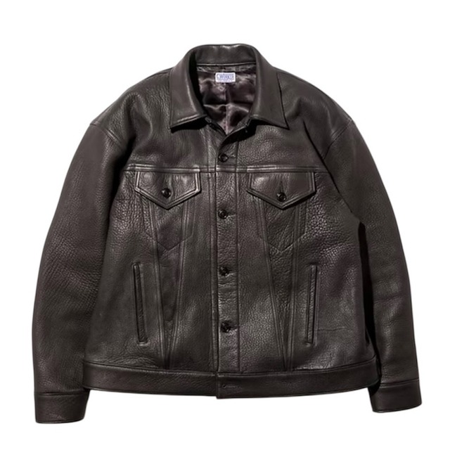 - CWORKS - 「FINE CREEK LEATHERS」を生産している レザーファクトリー「CREATIVE WORKS」の スタッフウェア というコンセプトで2018年にスタート ヴィンテージのディテールを搭載しつつ 強度や動きやすさを考慮したシルエットや仕様を追求。 「FINE CREEK LEATHERS」が解釈する ヴィンテージレザーウェア同様 独自の解釈がされた唯一無二のワークウェアです CWJK012 Ban Field Deer [OUTLINE] バンフィールドディアはヴィンテージの L社のジャケットをベースに オールレザーにて※46/48シリーズで展開 CWORKSらしい独自のフィルターを通し 製作された新感覚のレザージャケット *46/48シリーズとは "タウンユースのワークウェア"を 体現するCWORKSの本シリーズ。 二サイズ展開のルーズシルエットながら 各所のディテールやサイズバランスに 細やかな調整を施し"ただ大きいだけでなく" 着用時に美しく映えるシルエットが魅力。 [LEATER] フルベジタブルタンニン鞣し、芯通し素上げ 1.6mm〜厚の上質なディアスキン (鹿革) 選定 その肉厚でボリュームのある着心地に加え 着込むほどに増していく程よい艶感に 独特のシボ上に深く刻み込まれる無数の皺 より着やすく変化する着心地を堪能できます 特に46、48シリーズでは大判なものを贅沢に使用 [ Lining ] 袖通しの良いキュプラ を選定 Size…46 / 48 Color…Black Material…Deer Skin Lining...Cupra 100% (Specs) Size46 着丈64cm 身幅72cm 肩幅59cm 袖丈60cm Size48 着丈66cm 身幅74cm 肩幅61cm 袖丈61cm ※誤差ご了承ください