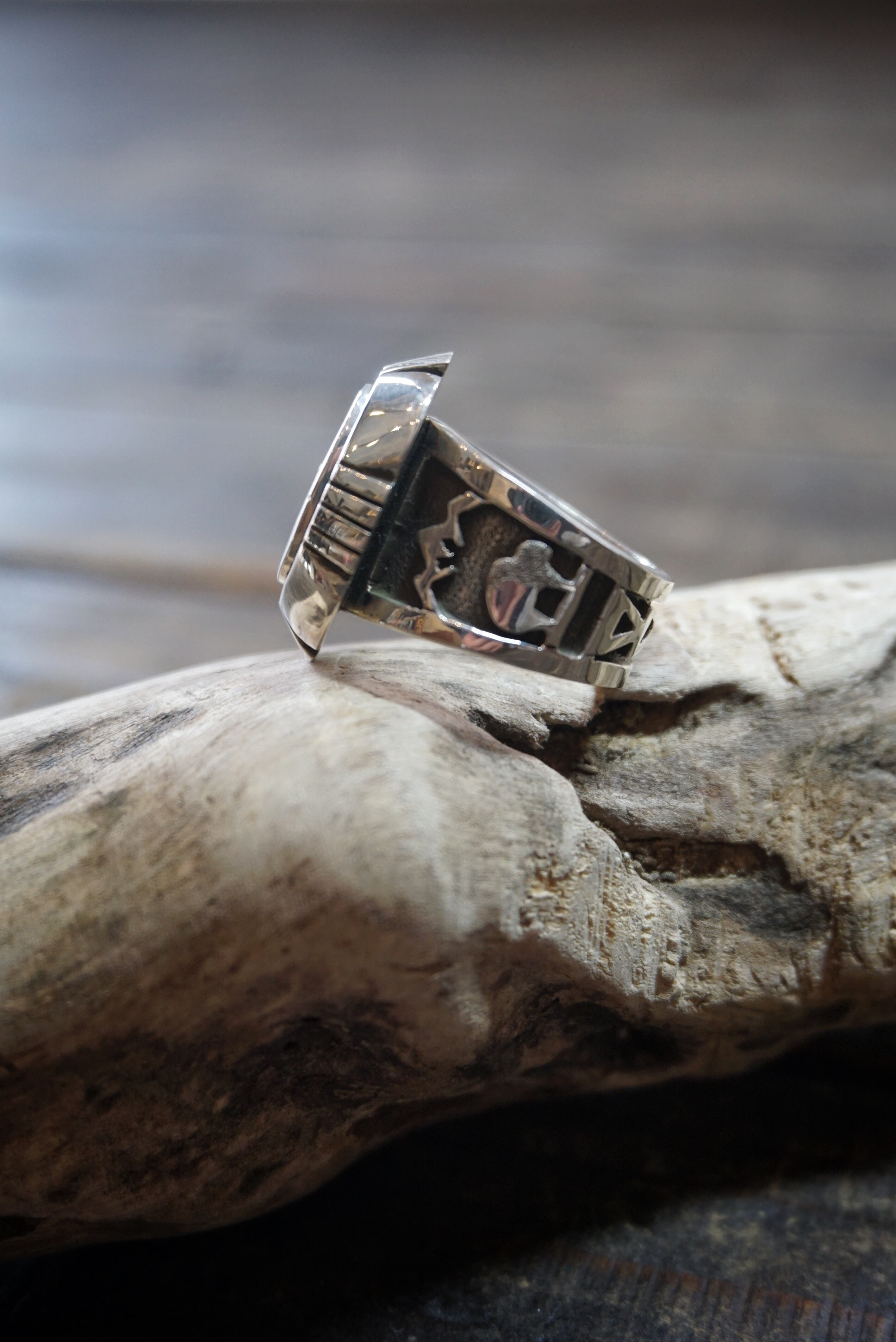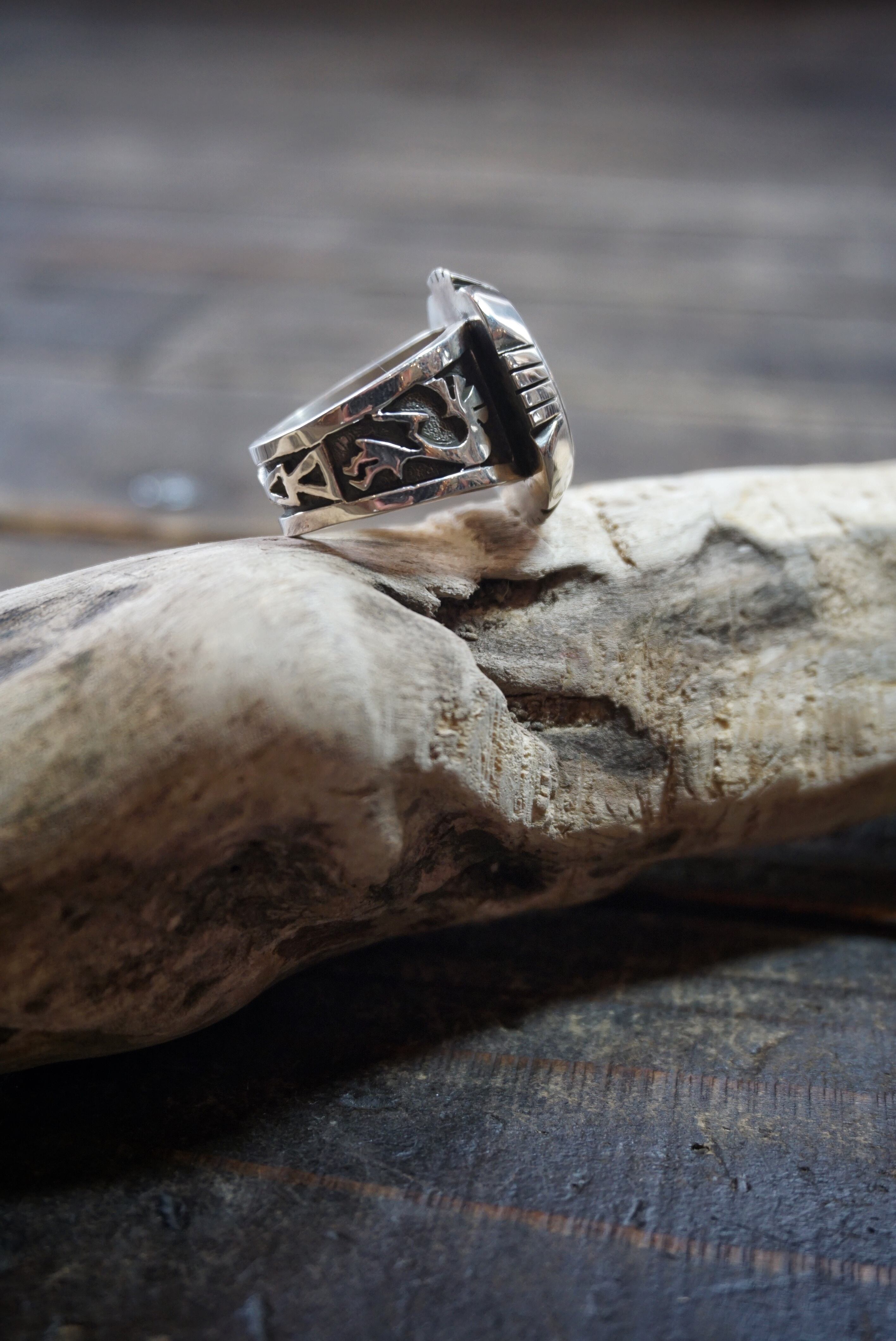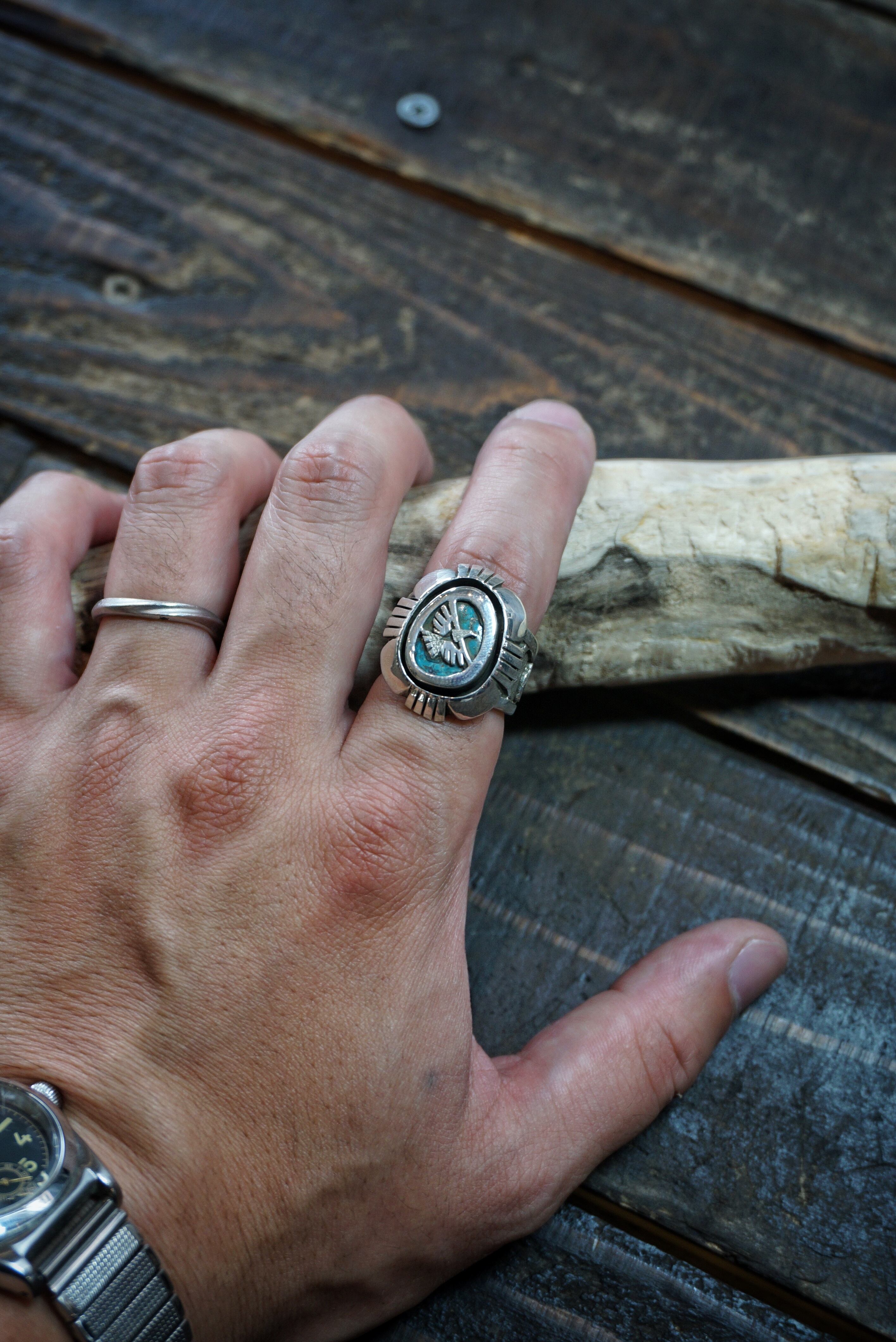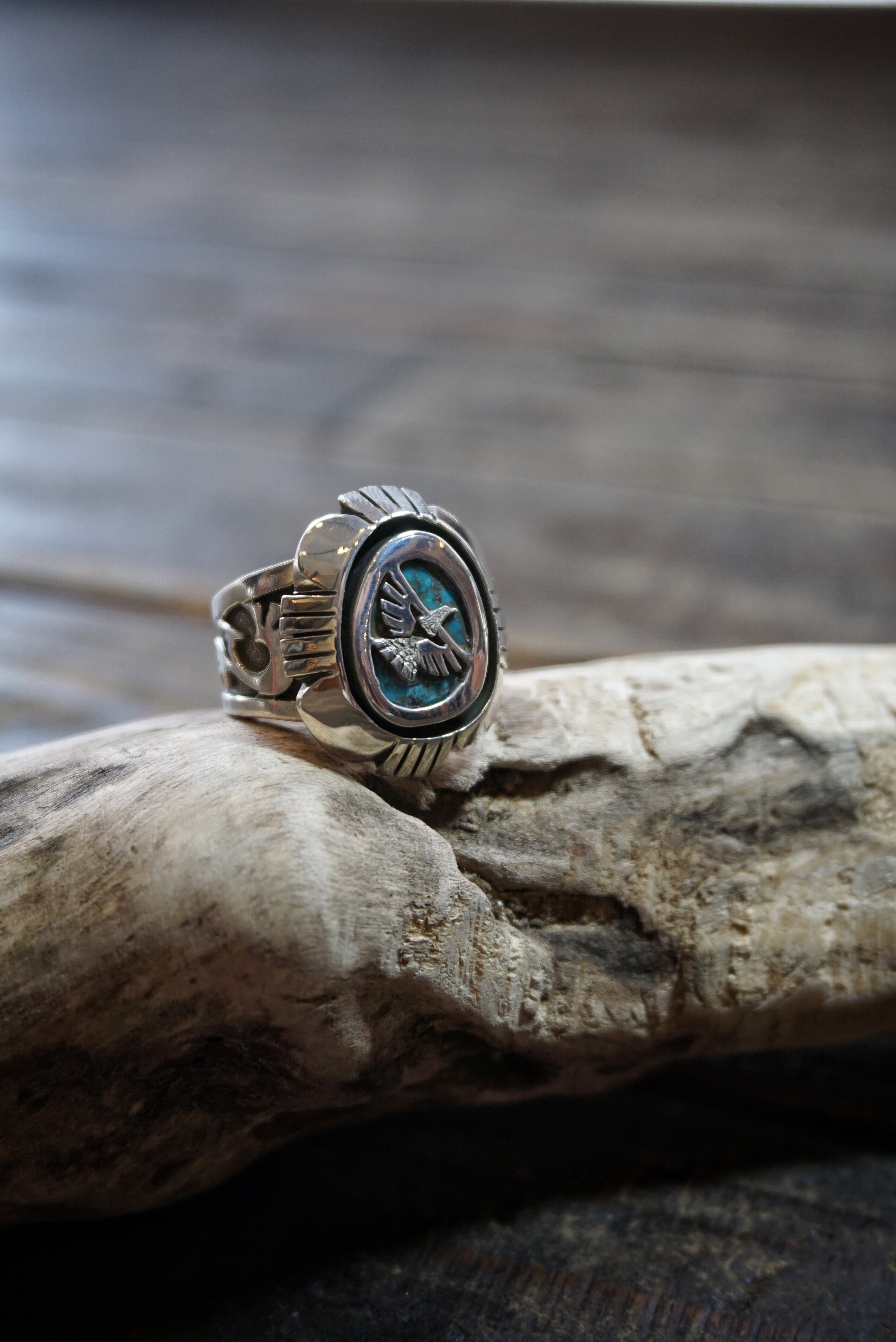 美しいPilot Mt (パイロットマウンテン) ターコイズ上にカッティングされたシルバーのイーグルがセッティングされた贅沢な逸品。